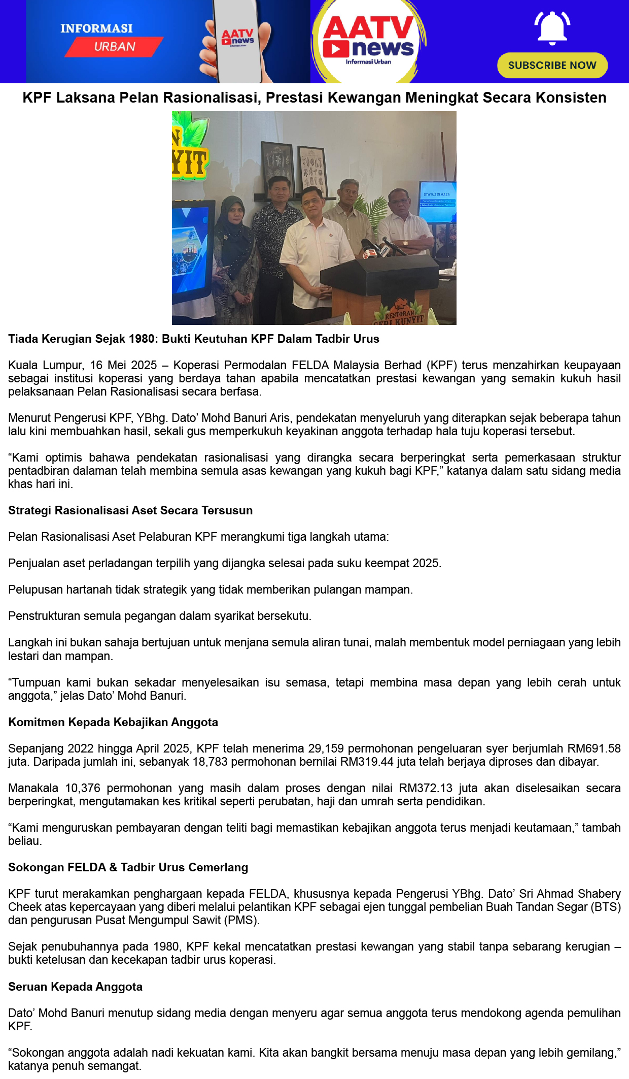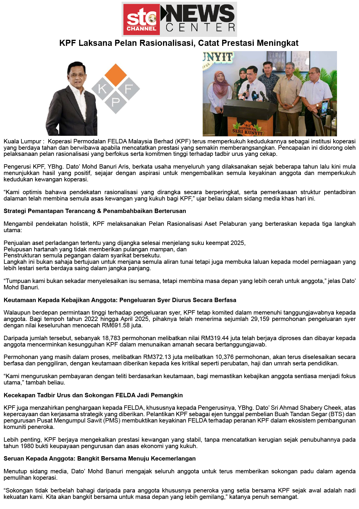 KPF Laksana Pelan Rasionalisasi, Prestasi Kewangan Meningkat Secara Konsisten