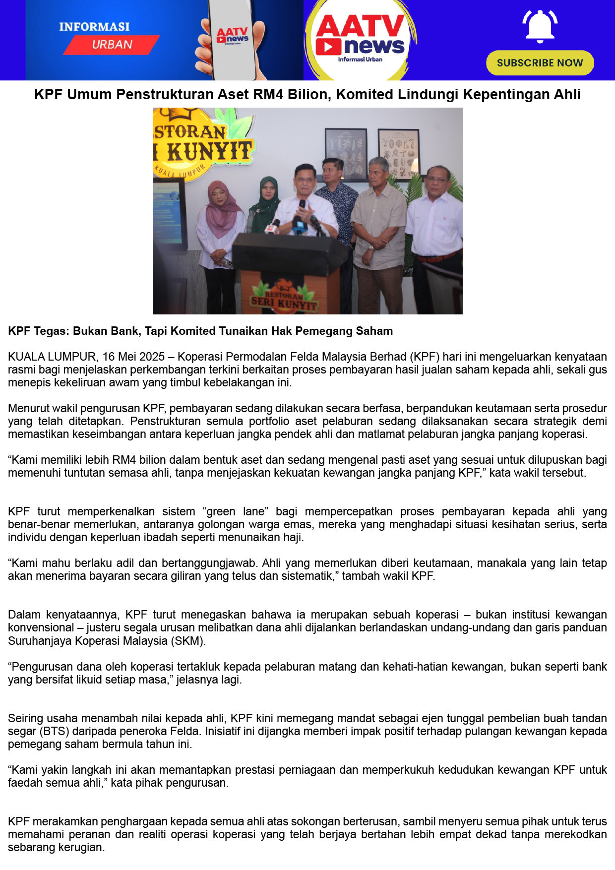 KPF Umum Penstrukturan Aset RM4 Bilion, Komited Lindungi Kepentingan Ahli
