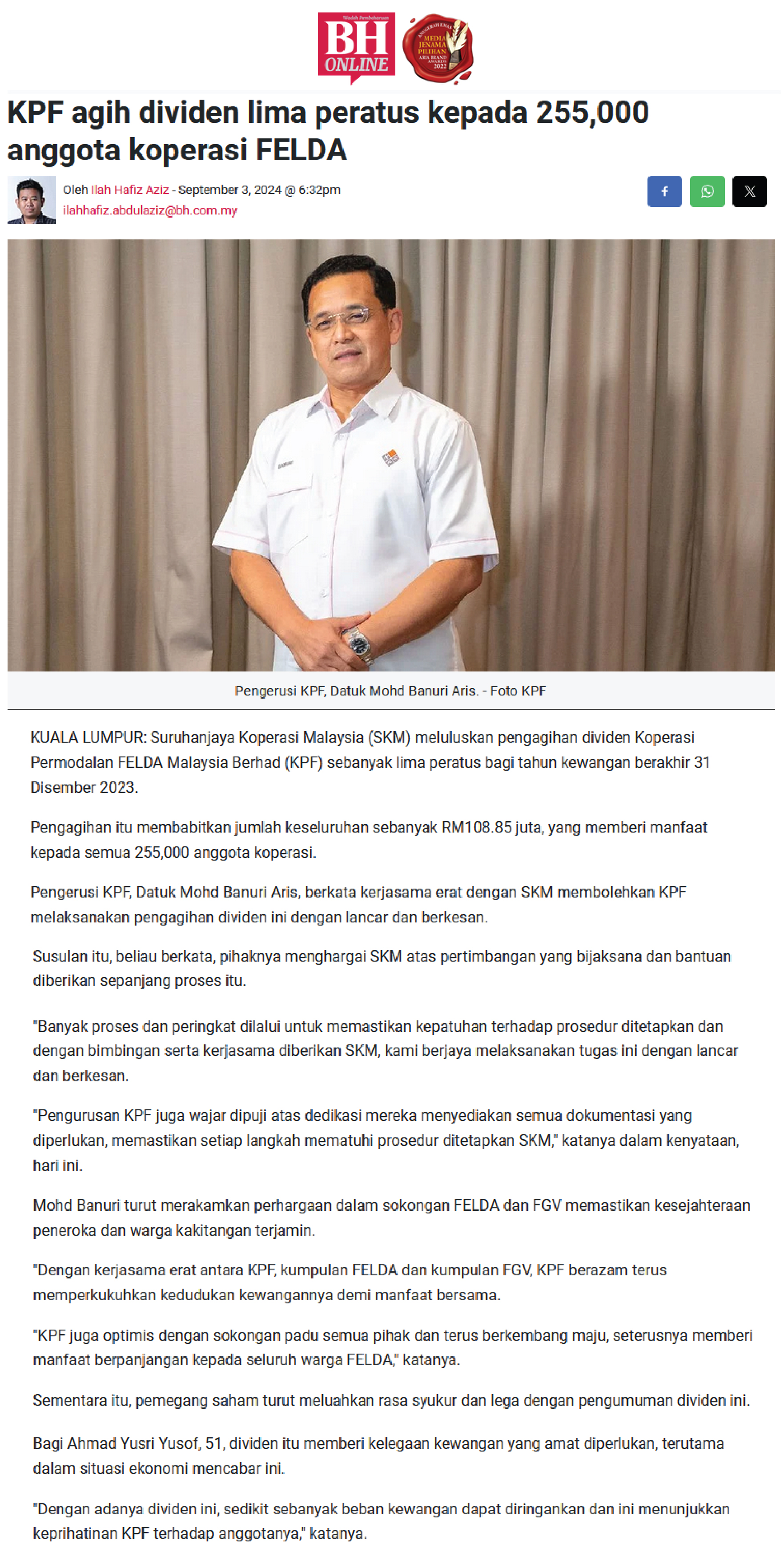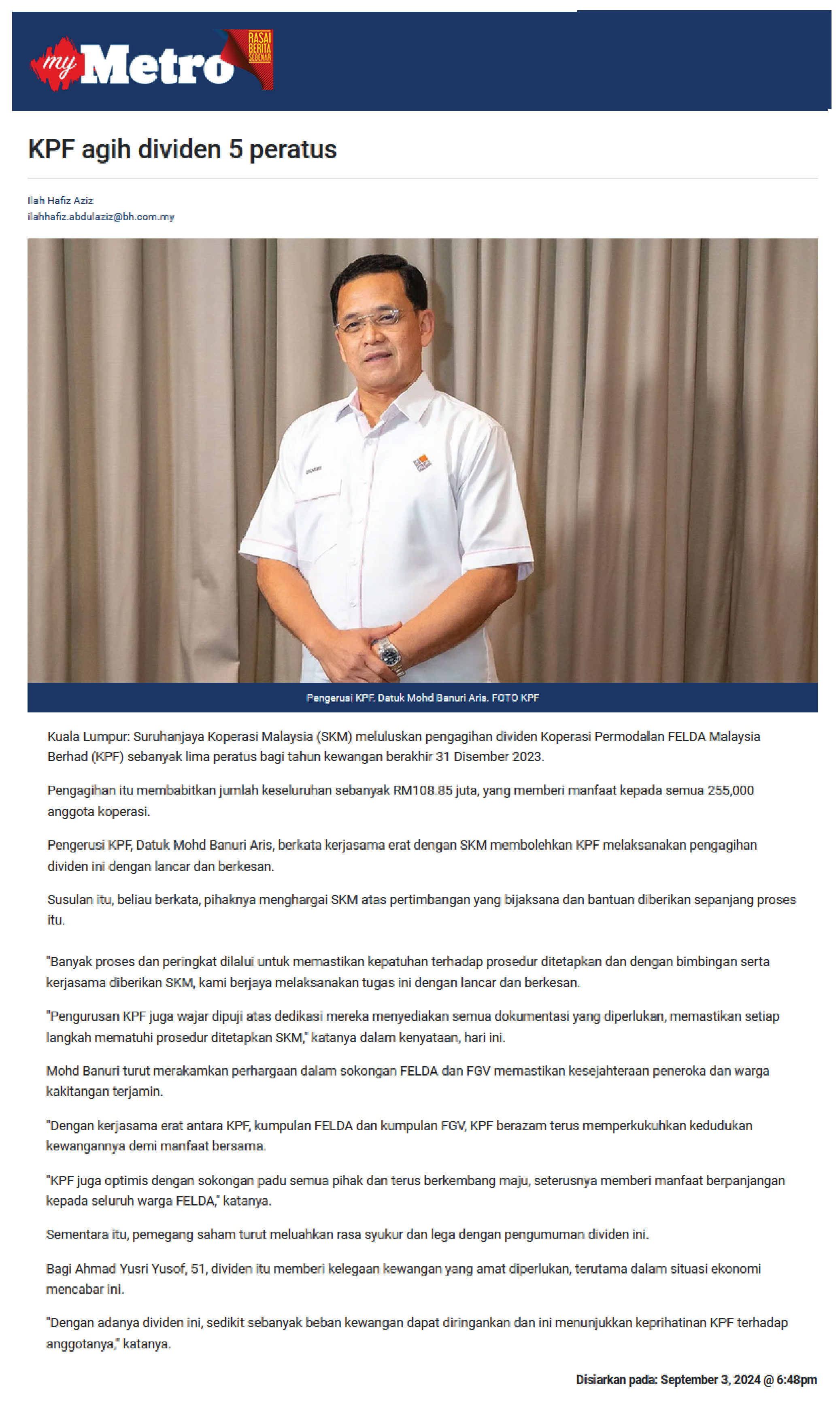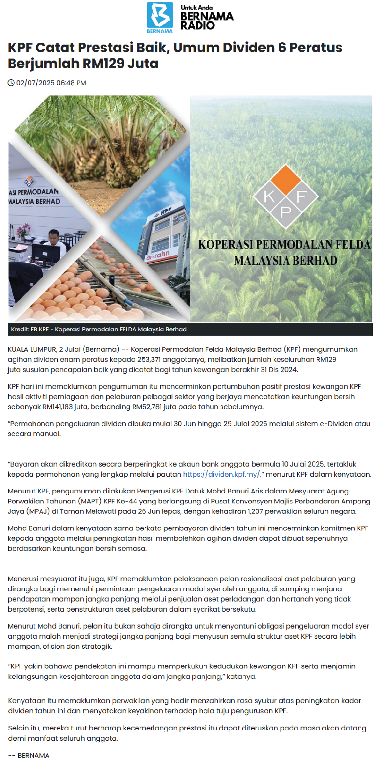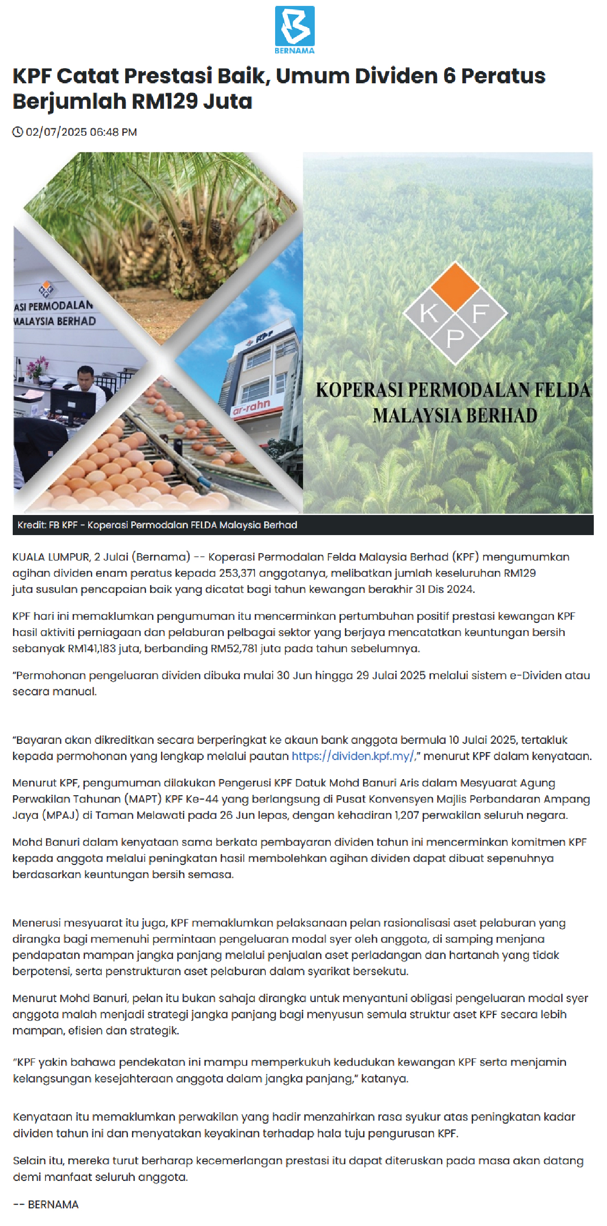 KPF Catat Prestasi Baik, Umum Dividen 6 Peratus Berjumlah RM129 Juta