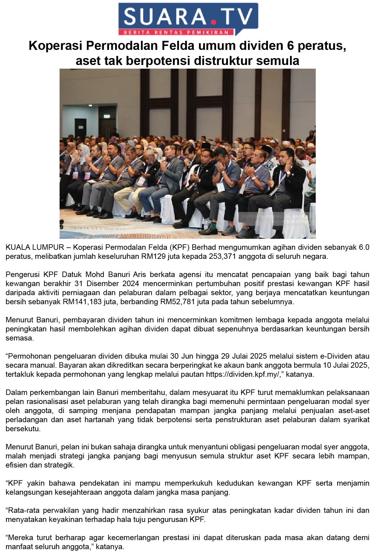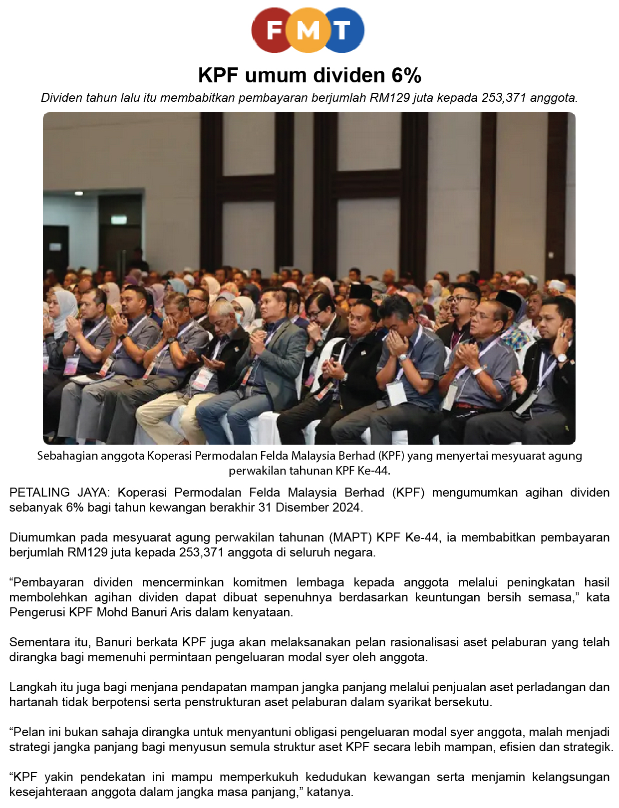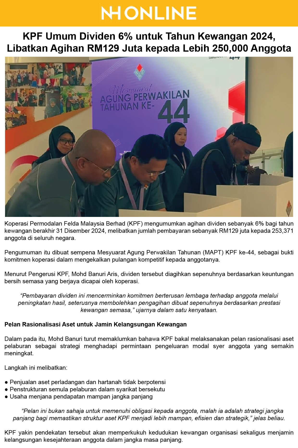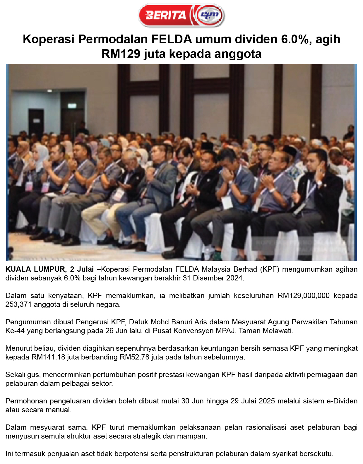 Koperasi Permodalan Felda Umum Dividen 6 Peratus, Aset Tak Berpotensi Distruktur Semula