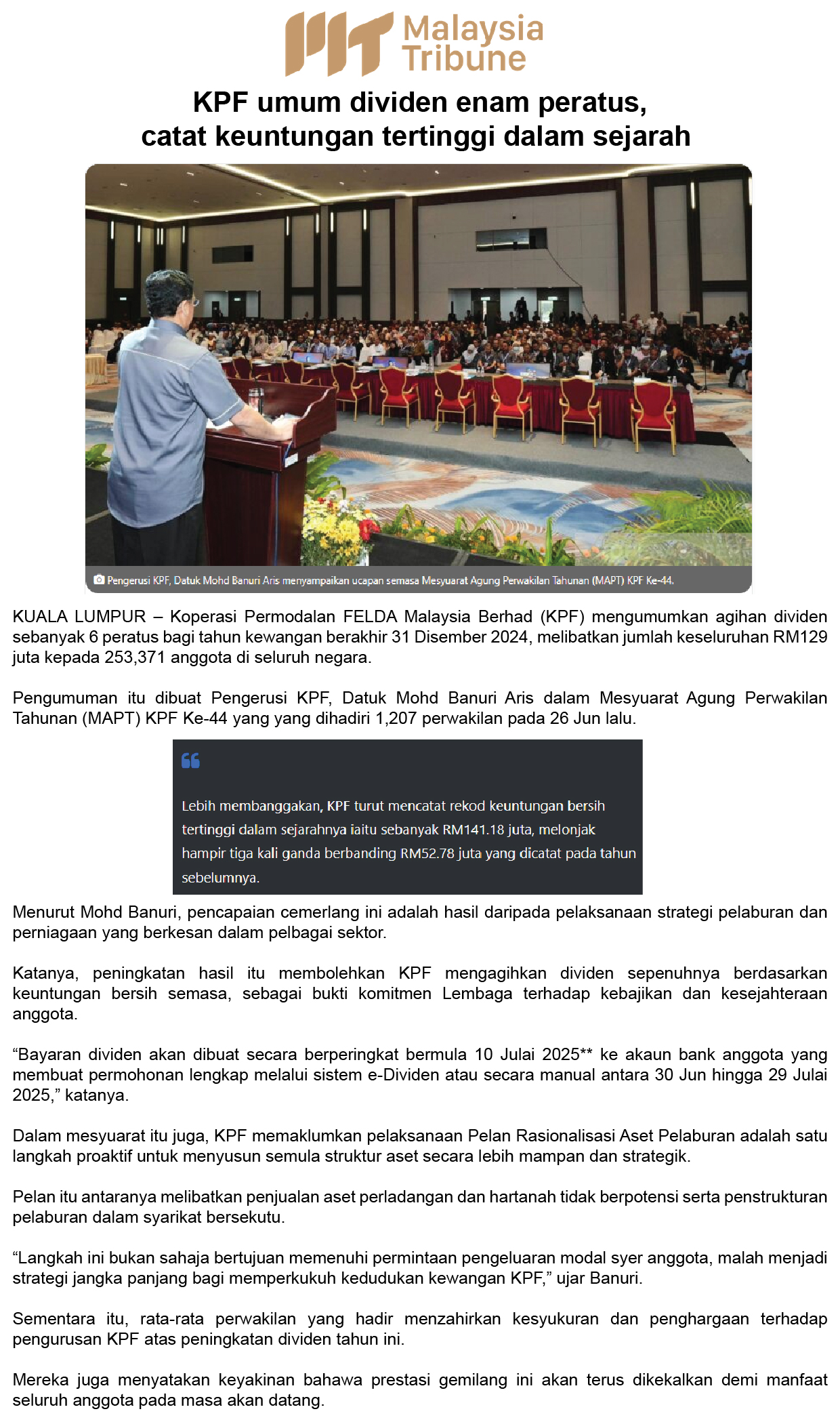 KPF Umum Dividen Enam Peratus, Catat Keuntungan Tertinggi Dalam Sejarah