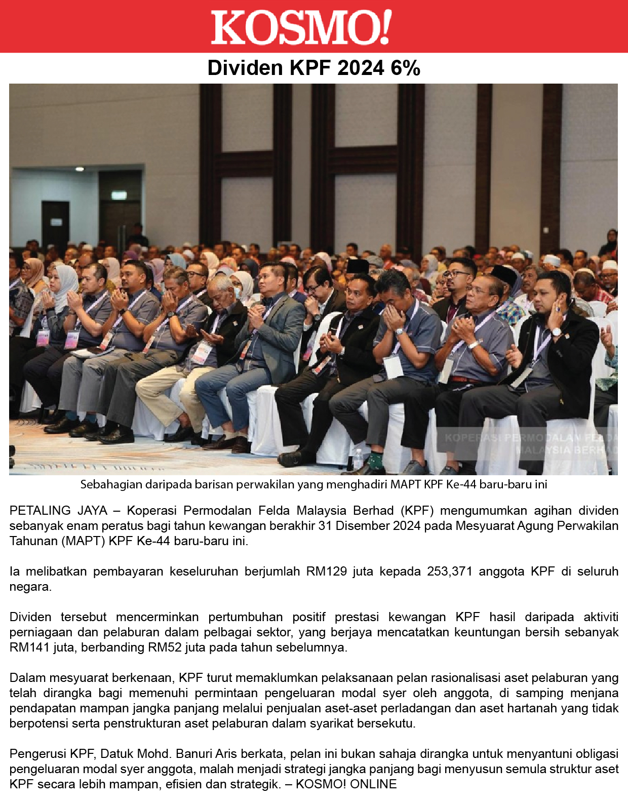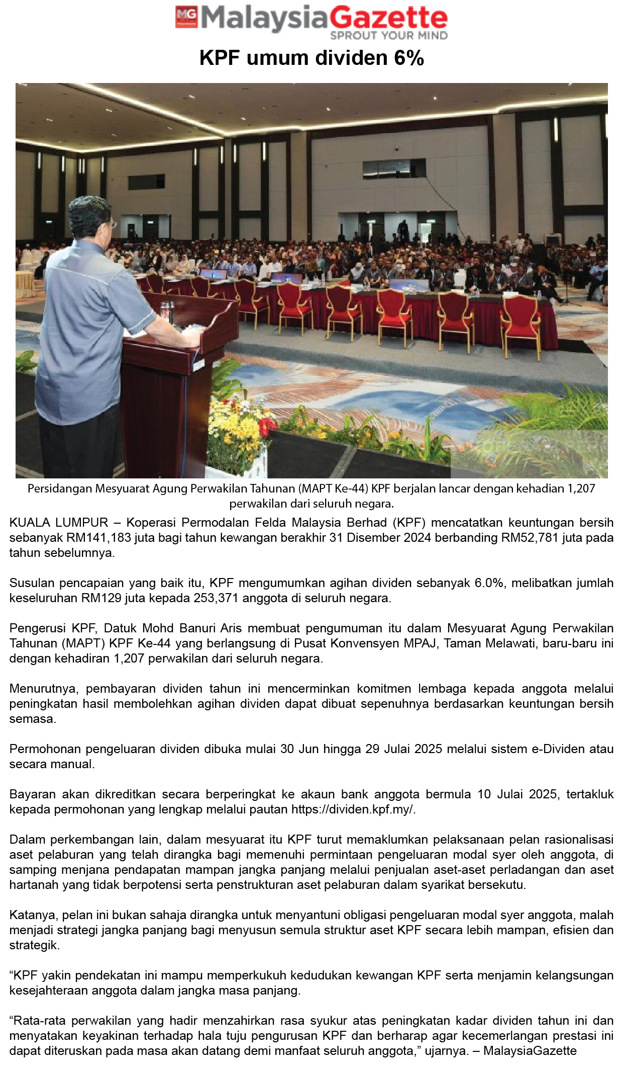KPF Umum Dividen 6% untuk Tahun Kewangan 2024, Libatkan Agihan RM129 Juta kepada Lebih 250,000 Anggota