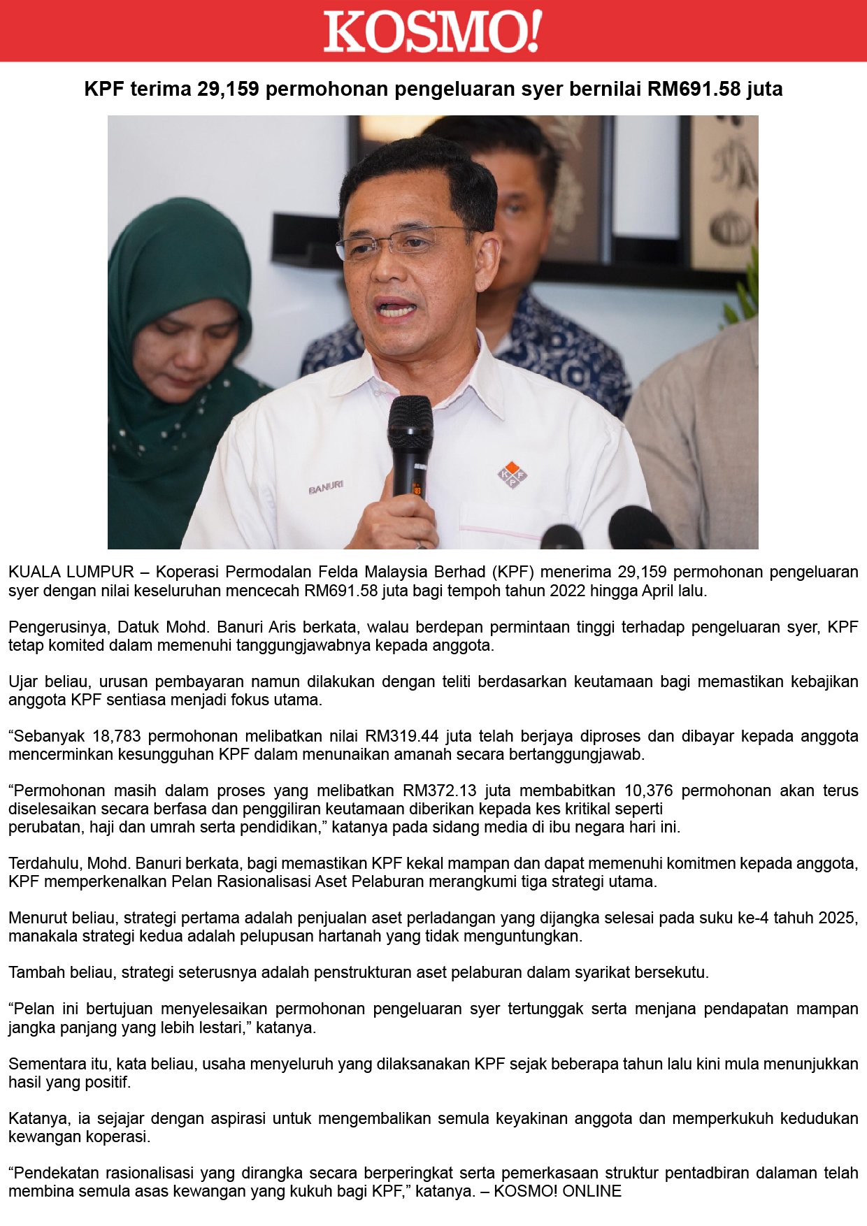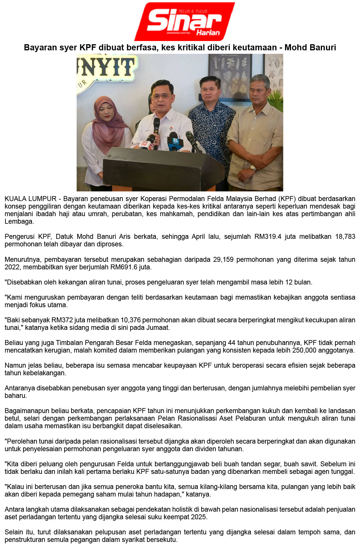 Bayaran Syer KPF Dibuat Berfasa, Kes Kritikal Diberi Keutamaan - Mohd Banuri
