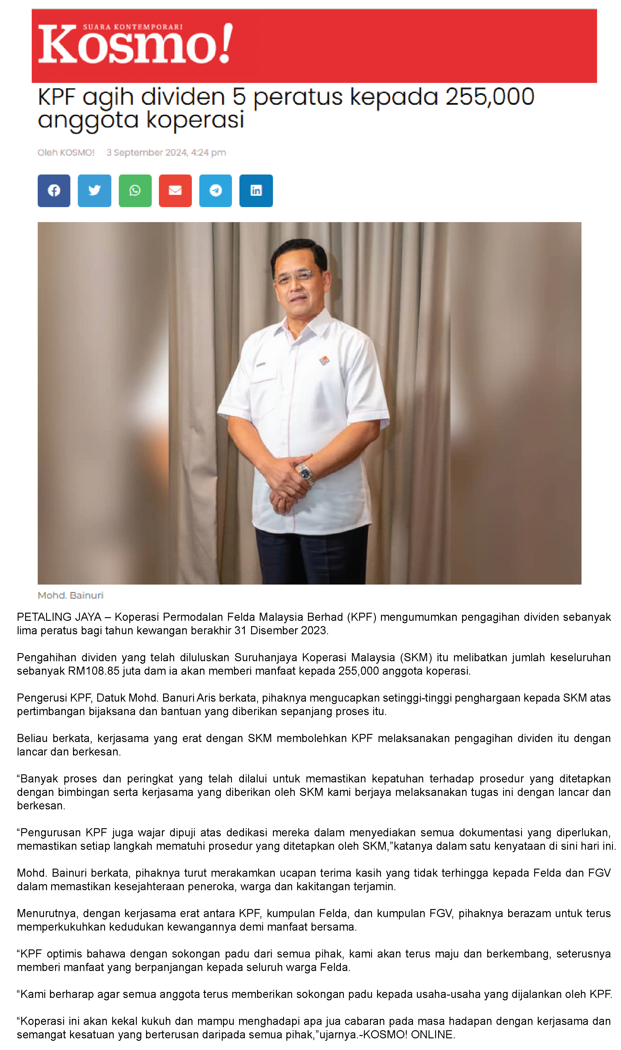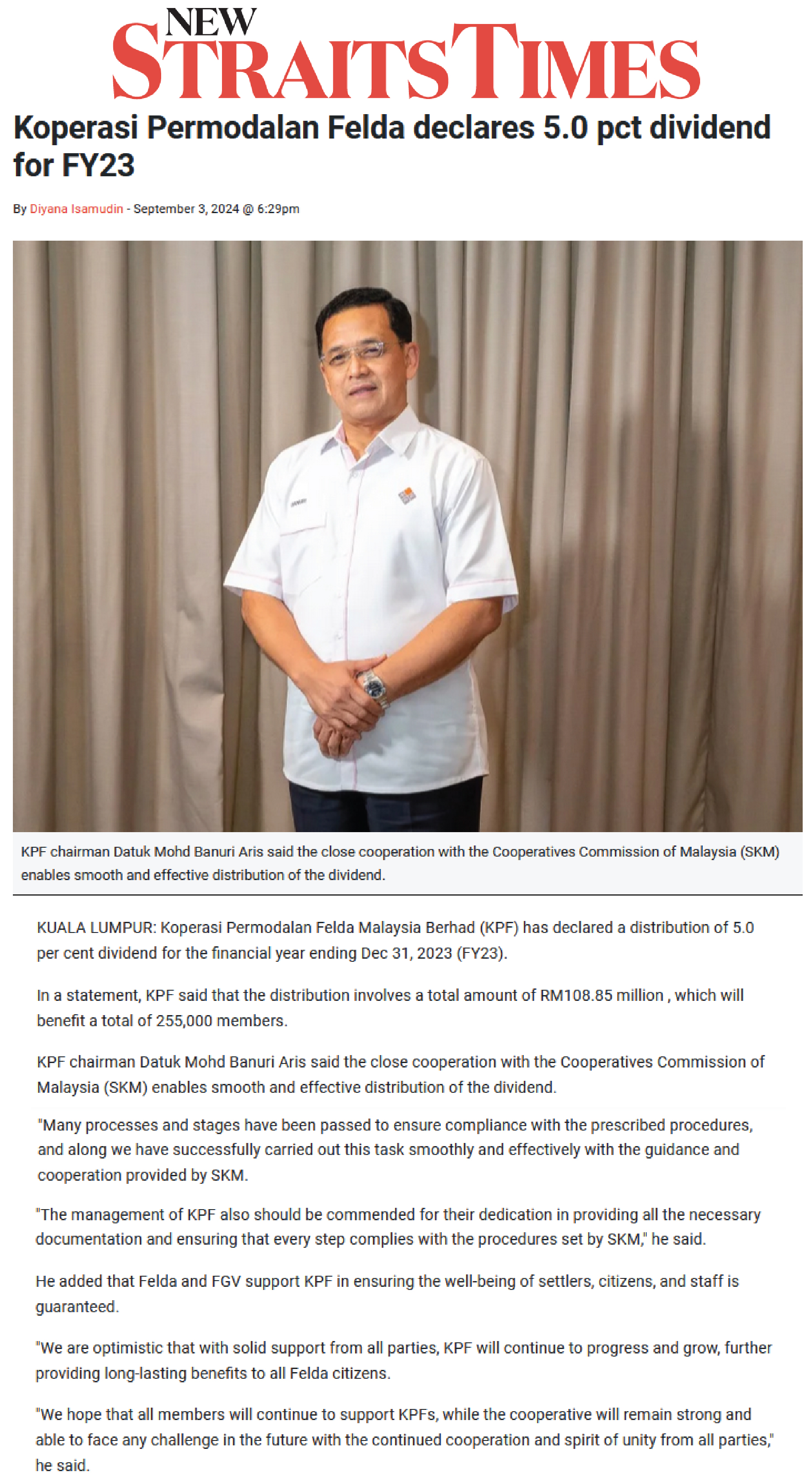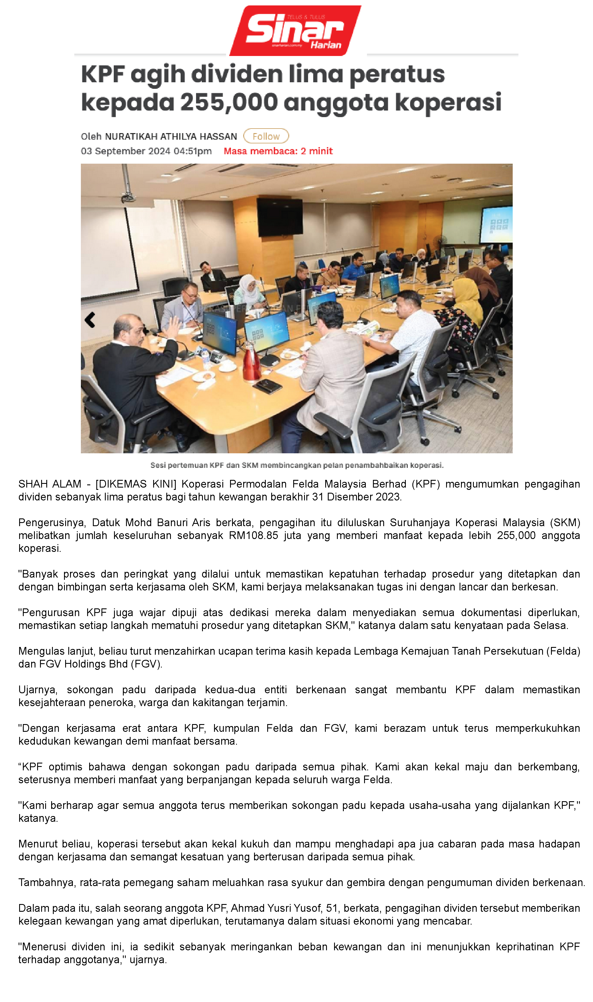 Koperasi Permodalan Felda Declares 5.0 Pct Dividend For FY23